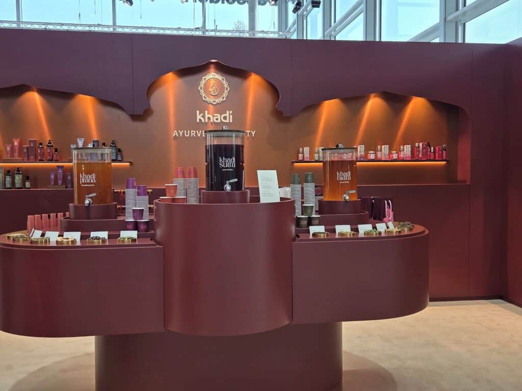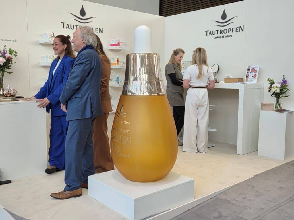 Ein DJ sorgt für Loungemusik, die Dekoration ist mit aufwendigen blauen Pflanzen- und Blumeninstallationen gestaltet. Tageslicht fällt in das rundum verglaste Foyer der Halle 1 der Düsseldorfer Messe. Die Atmosphäre ist entspannt und ruhig – auch in den zum Teil sehr langen Warteschlangen vor einzelnen Ständen kein genervtes Drängeln. Cremes und Öle werden ausprobiert, Rosenwasser ins Gesicht gesprüht, Haare stylisch geföhnt und Selfies gemacht.