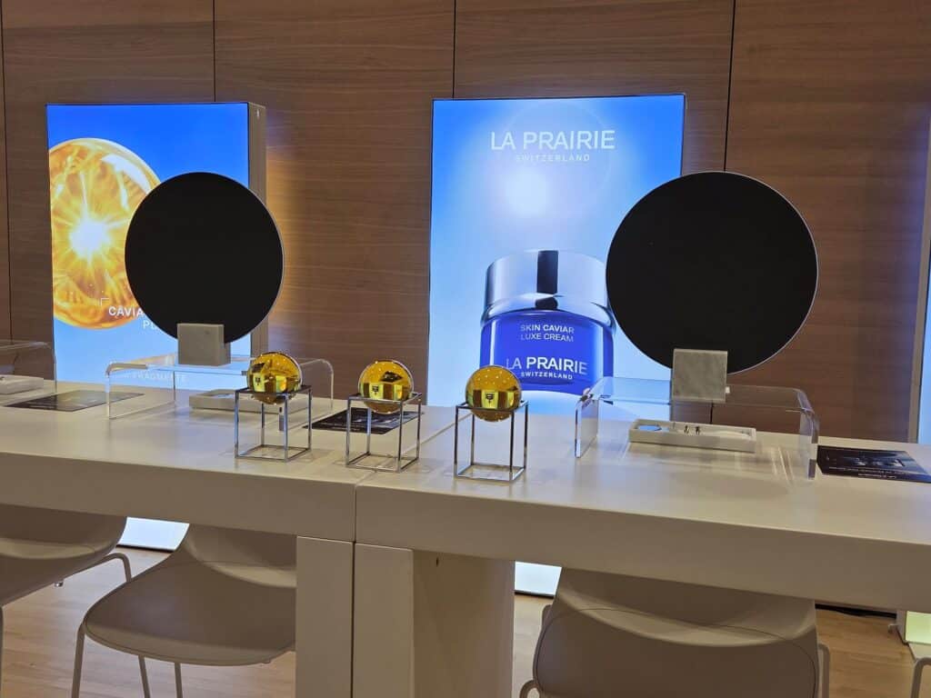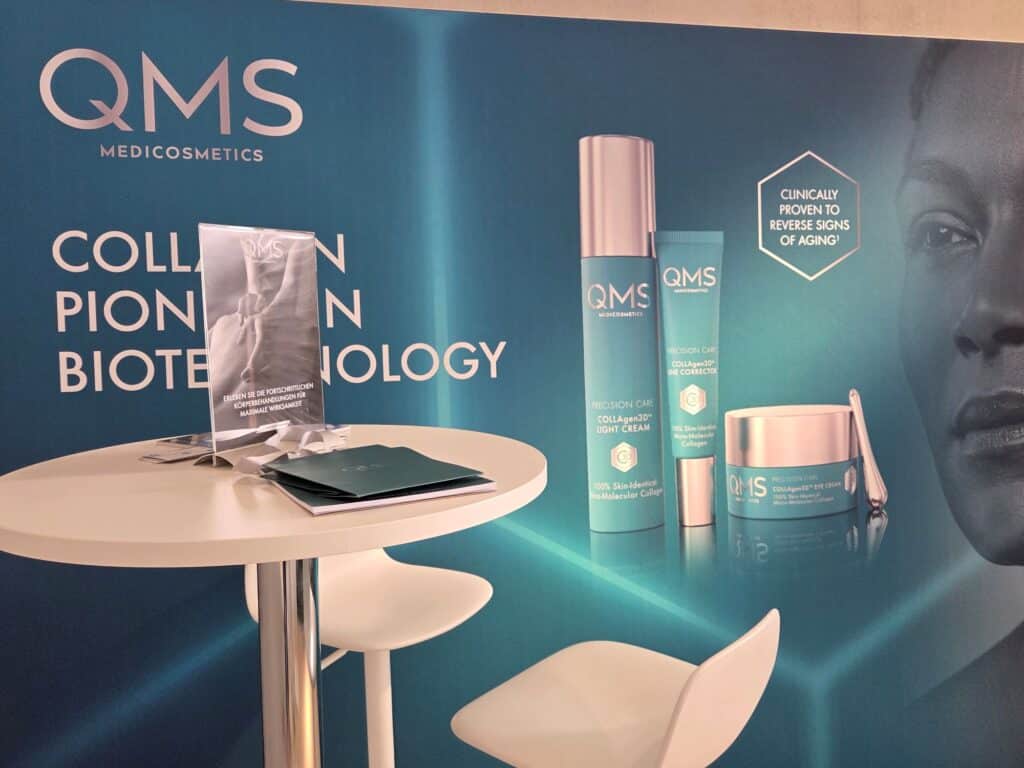Neben der großen Tasche voller Präsente für jeden Besucher, der die knapp 50 Euro Eintritt bezahlt hat, gibt es überall Produkte zu gewinnen oder Pröbchen zum Mitnehmen. Sicherlich ein Pluspunkt der Messe in Puncto Attraktivität für Besucher. Doch der Hauptaspekt liegt in der Information. Um Marken kennenzulernen, die sich ganz neu dem B2C-Segment öffnen. Die beispielsweise aus dem medizinisch-klinischen Bereich über die Spas internationaler Fünf-Sterne-Hotels so den Weg zum Endverbraucher finden. Wie QMS Medicosmetics: Heike Zils, Trainerin für Kosmetikstudios in Deutschland, berät am Stand umfassend über Kollagen- und Hyaluronprodukte sowie ihre Wirkungen. Den Ursprung hat diese Marke in der medizinisch-kosmetischen Versorgung.